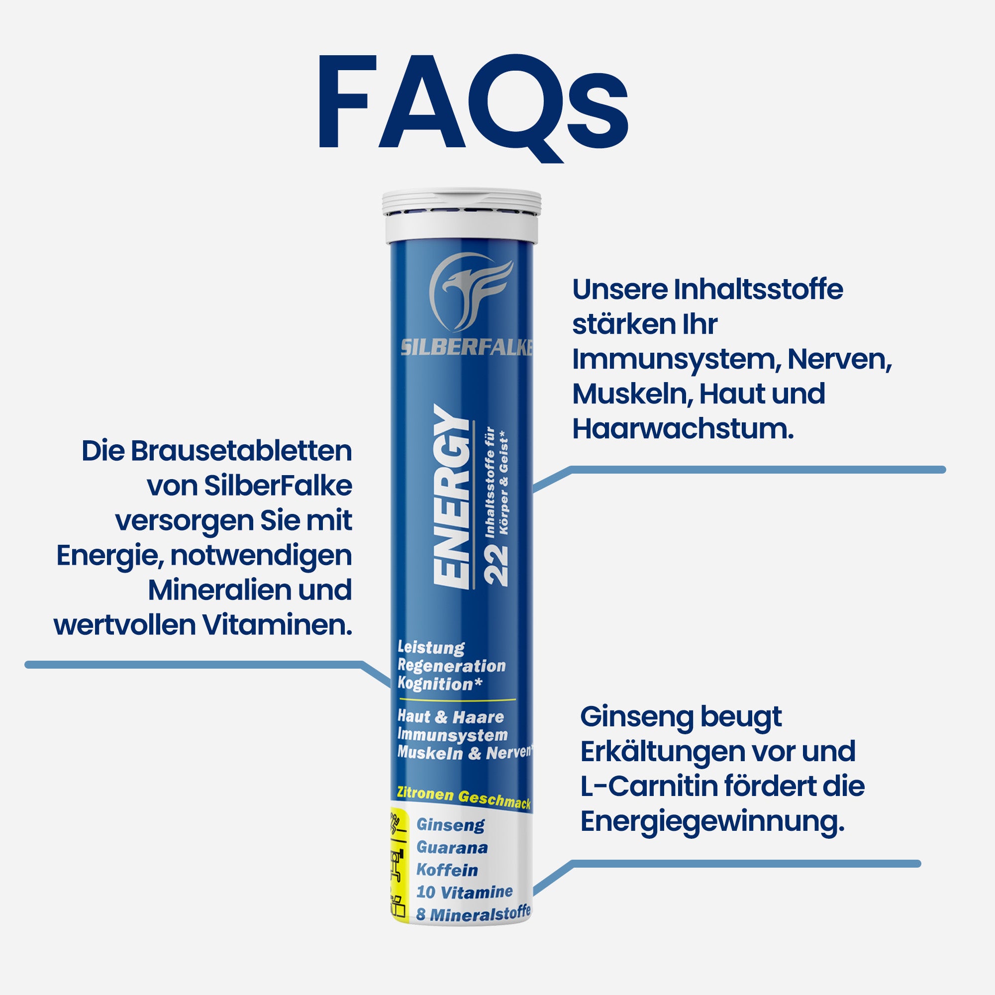 SilberFalke Energy Brausetabletten – Dein täglicher Energieschub mit 10 Vitaminen, 8 Mineralstoffen und natürlichem Koffein. Erhältlich als 1er Pack (10 Stück), 5er Pack (50 Stück) oder 10er Pack (100 Stück) – für maximale Flexibilität und Ersparnis. Vegan, glutenfrei und perfekt für Alltag, Sport oder Büro! Einfach in Wasser auflösen und genießen.